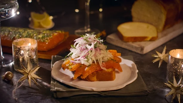 Gravadlax de salmón de Mark Moriaty, brioche tostado y ensalada de hinojo